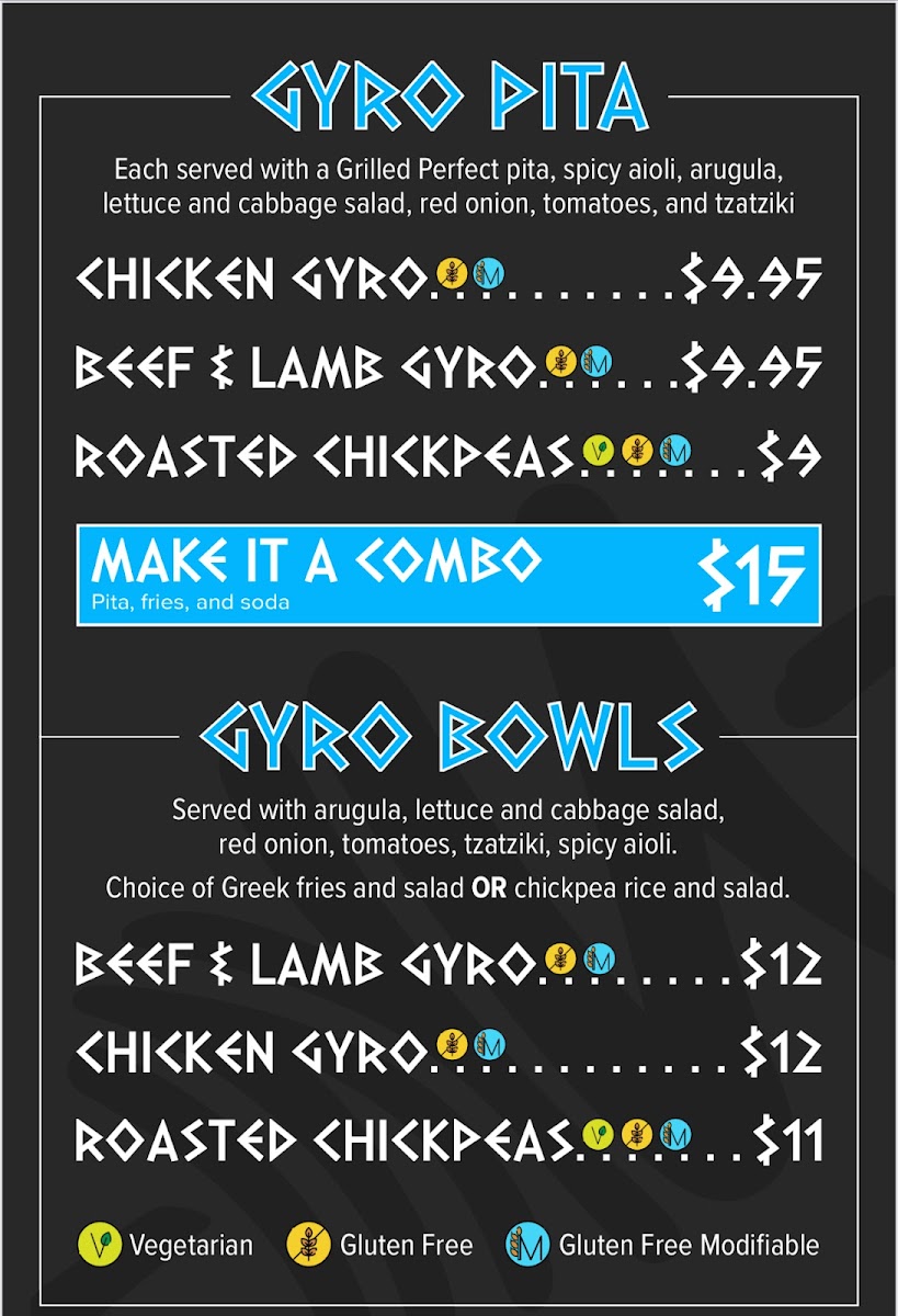 Chicken gyro, perfectly grilled pita, spicy aioli, arugula, lettuce and cabbage salad, red onion, tomatoes, and tzatziki.